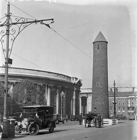 In 1932, College Green in central Dublin was not just a busy urban space but also a focal point of one of the largest public events in the early Irish Free State, the International Eucharistic Congress. As part of the celebrations in June 1932, a temporary 45-foot wooden and canvas round tower was erected in the middle of College Green on the site of the former King William III statue, symbolising a blend of religious pride and national identity in post-independence Ireland. The plaza, flanked by the historic Bank of Ireland building and Trinity College, was filled with crowds attending processions, pageantry, and civic gatherings, reflecting both the deep Catholic heritage and the evolving civic life of Dublin at the time.